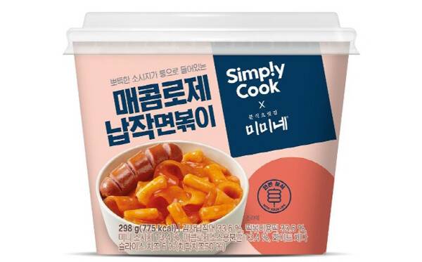 심플리쿡은 떡볶이 프랜차이즈인 ‘미미네’와 손을 잡고 다양한 떡볶이 제품을 공급하고 있다. 최근에 출시된 제품은 ‘매콤로제 납작면볶이’로, 납작당면과 소시지가 들어간 로제떡볶이 제품이다. 납작당면은 감자로 만들었으며, 떡볶이용 밀가루 떡도 들어있다. 이름에 매콤이란 단어가 들어있지만 그리 매운 편은 아니며, 짭짤하게 맛있는 소시지와 함께 먹기 좋은 적당한 매콤함이다. 편의점 기준 판매가는 4,300원이다.