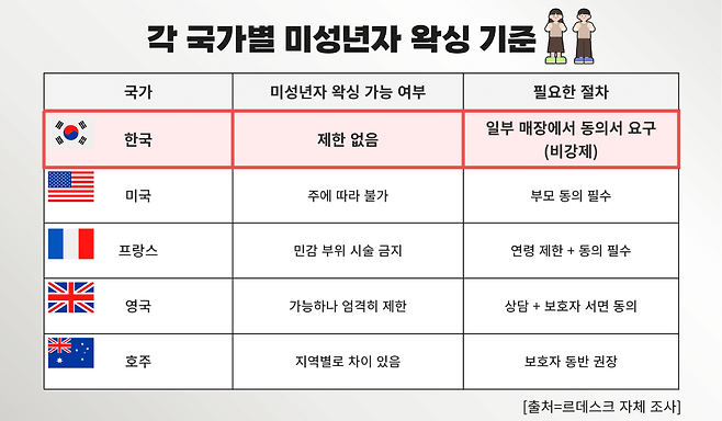 문제는 미성년자를 대상으로 한 왁싱 시술이 특별한 법적 규제 없이 이뤄지고 있다는 점이다. 현재 국내에는 청소년의 왁싱 시술을 제한하거나 보호하는 명확한 법적 근거가 없다. 일부 왁싱숍은 자체적으로 보호자 동의서를 요구하지만, 이는 업소 재량에 따른 것으로 강제성은 없다.