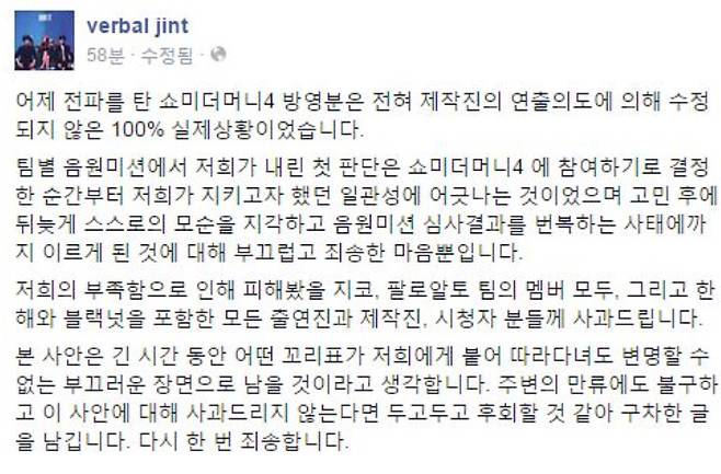 결국 프로그램 내외부적으로 수많은 비판을 받은 산이, 버벌진트는 공식적인 사과문까지 게재했지만, 여전히 '번복' 꼬리표가 붙었다고 하네요!