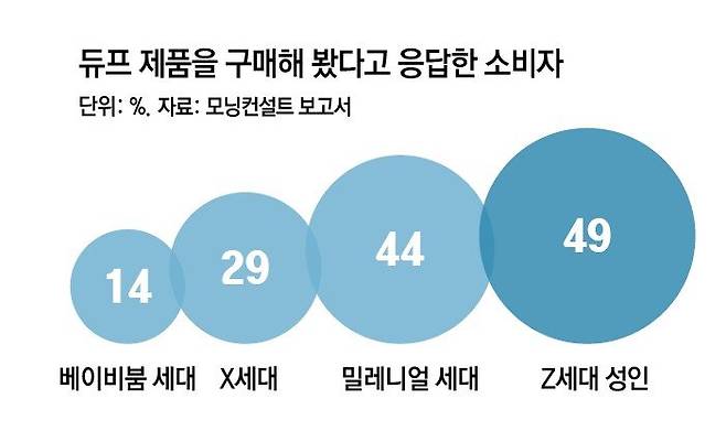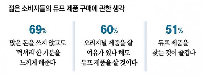 미국 시장조사업체 와이펄스의 설문조사 결과에 따르면 MZ세대 응답자의 절반가량은 ‘복제품을 찾는 건 흥이 나는 일’(51%)이라고 답했다. 저렴한 듀프 제품을 찾는 것을 일종의 ‘게임’처럼 즐기는 것이다. 전미영 소비트렌드분석센터 연구위원은 “짝퉁 소비는 구매력이 부족한 상태임에도 원본의 아우라에 대해 추종하고 싶은 마음을 기반으로 한 것이기 때문에 듀프 소비와는 결이 좀 다르다”며 “듀프는 원본의 아우라를 좇기보다는, 이 돈으로도 그런 성능이 나온다는 태도에서 나오는 소비 행태”라고 설명했다.