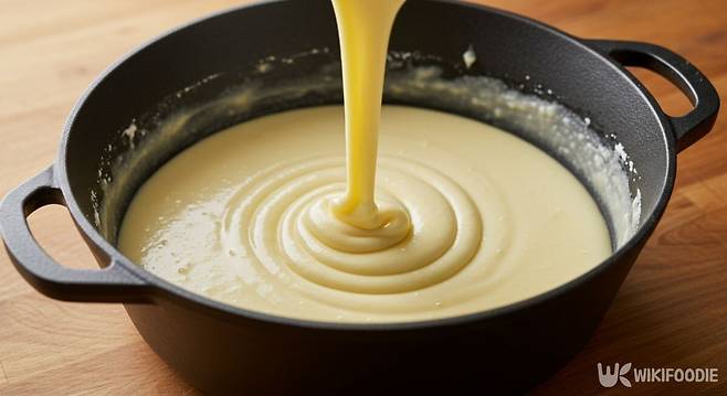 반죽이 완성되면 냄비에 천천히 붓는다. 기포 제거를 위해 냄비를 바닥에 살짝 내려놓거나 반죽을 높이 들어 떨어뜨리면 좋다. 표면은 스크래퍼로 정리해 평평하게 만든다.