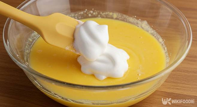 6. 머랭 일부(주먹 크기)를 노른자 반죽에 먼저 섞고, 나머지 머랭과 합친다.