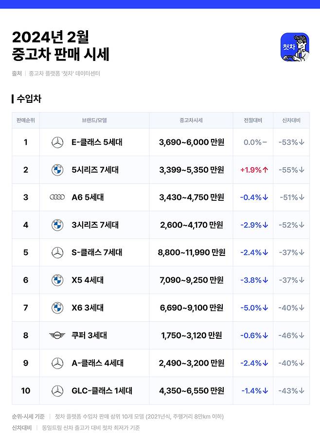 2024년 2월, E-클래스 5세대와 A6은 시세 이동이 미미하며 보합에 머무를 것으로 보여요.