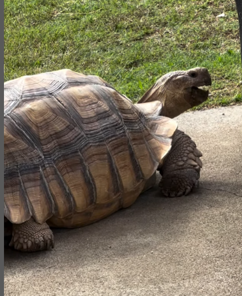 미국의 한 주택 수리 현장에서 뜻밖의 손님이 등장해 공사 인부들을 깜짝 놀라게 했다. 현관 앞에서 천천히 기어 들어오는 거대한 설카타 거북 때문이었다.