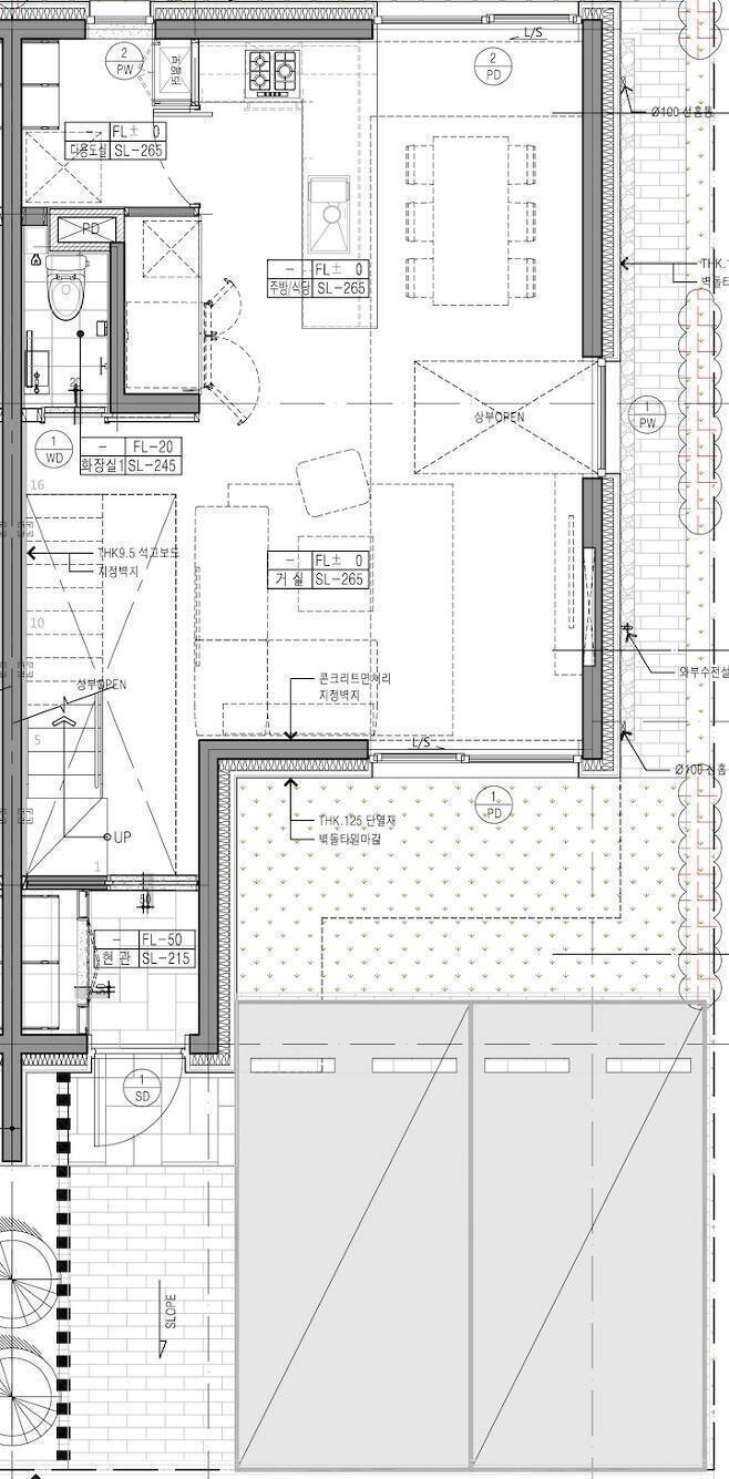 최근에는 거실과 바로 이어지는 싱크대로의 시선 차단을 위해 싱크대 단부에 공간 분리를 위한 가벽 설치를 고려하고 있습니다.