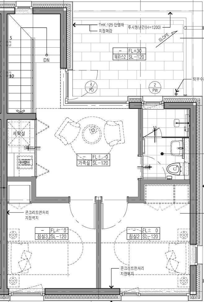 * 3층 : 방 2, 3 + 가족실 + 화장실 + 테라스