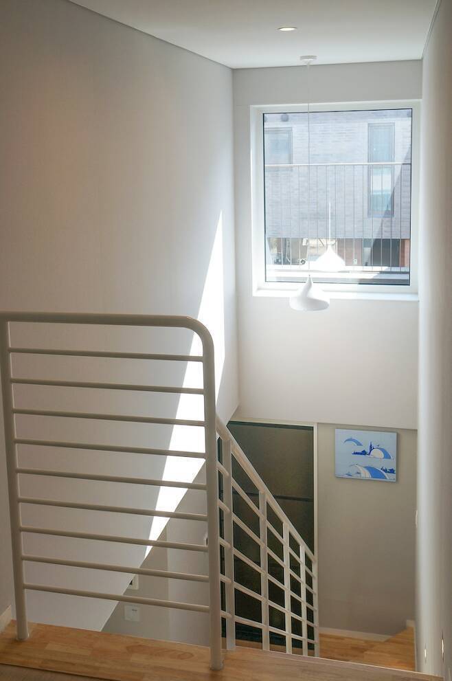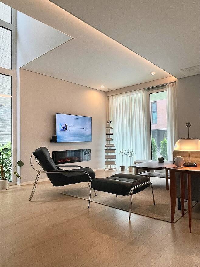 다른 한 곳은 거실의 2층까지 길게 이어진 통창입니다. 1층에서 2층까지 뚫려있는 창 주변 공간이 거실의 개방감과 공간적 재미를 더해주는데 이 공간이 집에서 저희가 가장 좋아하는 부분이기도 합니다.