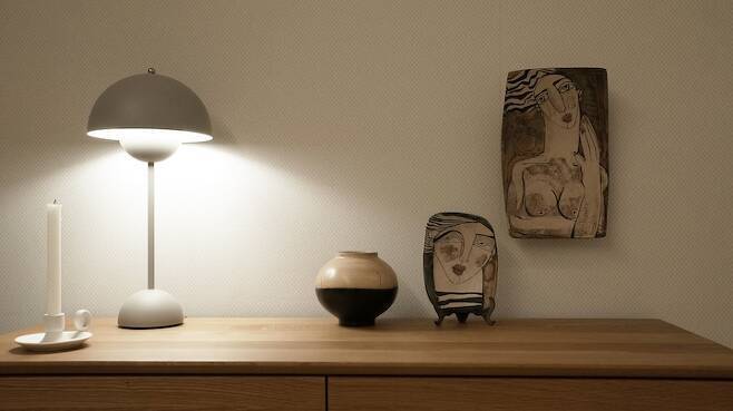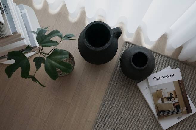 나무 외에도 둥근 형태의 항아리를 좋아해 세라믹 소재의 소품을 이용해 연출하기도 합니다.