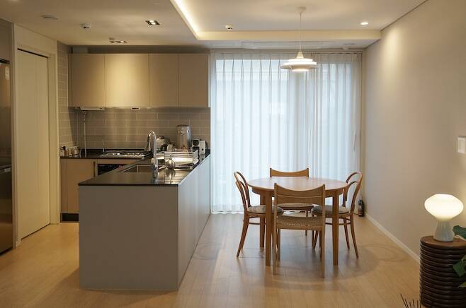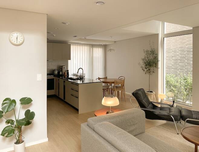 저희 부부가 가장 많은 시간을 보내는 1층 공간은 별도의 방 없이 거실과 주방, 화장실로 이루어져 있습니다.
