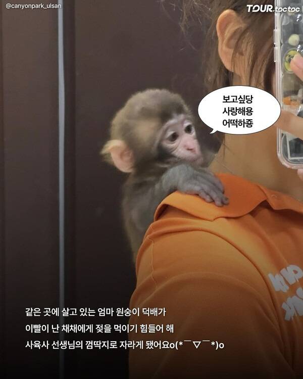 일본의 펀치가 오랑우탄 인형을 꼭 안고 하루를 보낸다면, 울산의 채채는 사육사 곁에서 개구리 인형을 좋아하며 자라고 있습니다.