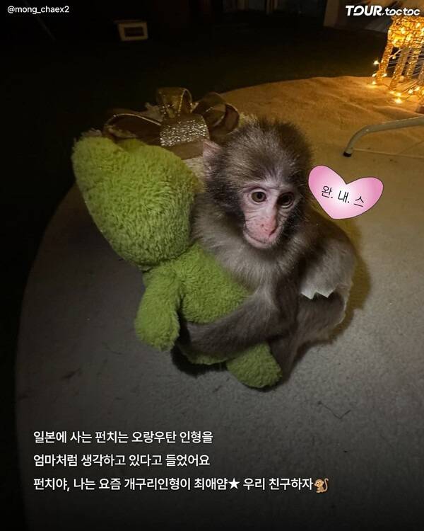 일본 이치카와시 동물원에 살고 있는 원숭이 ‘펀치’는 엄마에게 버림받은 뒤 오랑우탄 인형을 엄마처럼 의지하며 자라고 있다고 전해집니다. 인형을 꼭 안고 생활하는 모습이 알려지면서 많은 이들의 응원을 받고 있습니다.