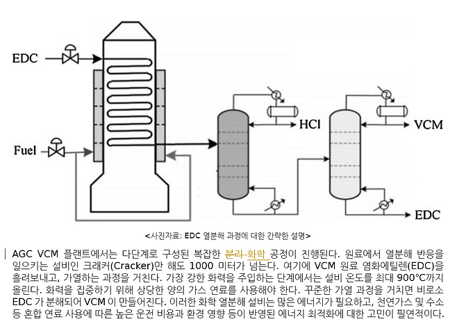 AGC VCM 플랜트에서는 다단계로 구성된 복잡한 분리 공정이 진행된다. 원료에서 열분해 반응을 일으키는 설비인 크래커(Cracker)만 해도 1000 미터가 넘는다. 여기에 VCM 원료 염화에틸렌(EDC)을 흘려보내고, 가열하는 과정을 거친다. 가장 강한 화력을 주입하는 단계에서는 설비 온도를 최대 900℃까지 올린다. 화력을 집중하기 위해 상당한 양의 가스 연료를 사용해야 한다. 꾸준한 가열 과정을 거치면 비로소 EDC 가 분해되어 VCM이 만들어진다. 이러한 화학 열분해 설비는 많은 에너지가 필요하고, 천연가스 및 수소 등 혼합 연료 사용에 따른 높은 운전 비용과 환경 영향 등이 반영된 에너지 최적화에 대한 고민이 필연적이다.