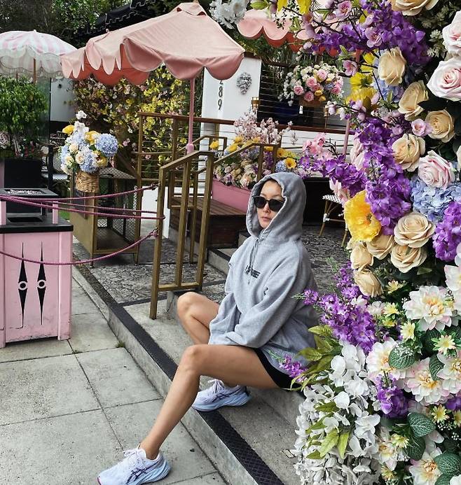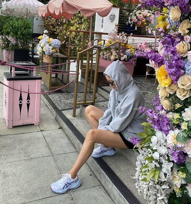 베이식 한 회색 후디에 검정 쇼츠의 조합. 기본이지만 멋스러워요.