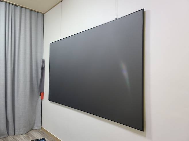 이사 오기 전 다른 오피스텔에 잠시 있었을 때는 벽타공을 할 수 없어서 와이어로 스크린을 걸어서 투사했었는데 와이어도 나쁘지 않았습니다.