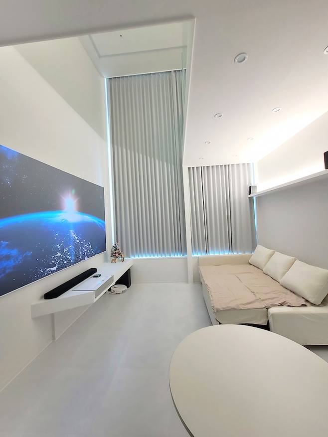 메인이 되는 프로젝터는 LG의 HU85LA 제품입니다. 초단초점 프로젝터여서 사람이 지나가거나 화면 사이에 장애물이 있어도 투사에 영향을 받지 않는 장점이 있습니다.
