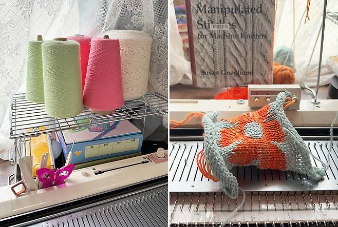 뜨개질 작업을 위한 공간을 소개하고 싶어요. 새 작품을 만들 때면 이곳에서 가정용 니팅 머신으로 테스트를 해요. 기계 주변에는 실을 두었고, 벽에는 뜨개질한 스와치(니트 원단)와 이전 작업에서 사용했던 견본들을 전시해 두어 영감을 얻을 수 있도록 했어요. 커다란 창문으로 들어오는 햇빛이 스와치를 한층 아름답고 흥미롭게 보이도록 하는 부분도 만족스러워요.