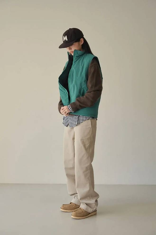 레이어링을 위해서는 또 필요한 것은 중간 아우터다. 그중 가장 활용도가 좋은 것은 베스트. 가을에서 겨울로 넘어가는 간절기에는 입던 가을 옷 위에 베스트만 걸쳐도 따뜻하고, 본격적으로 추워질 때는 패딩, 코트 같은 최종 아우터 직전에 입으면 보온성이 극대화된다. 몇 년 전 정장을 주로 입는 직장인이 교복처럼 입던 경량 패딩 베스트를 떠올리면 된다. 여기에서 주로 무채색인 경량 패딩 베스트에 아쉬움을 느낀다면 브루먼의 플리스 신슐레이트 베스트는 좋은 대안이 될 수 있다.