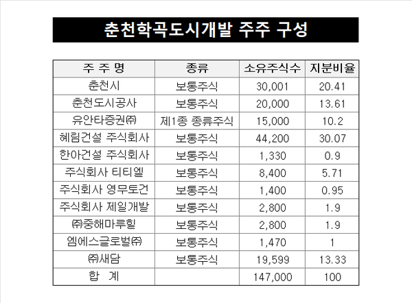 학곡지구개발사업은 춘천시가 과거 공설묘원과 화장장 일대를 신시가지로 조성하기 위해 2008년부터 추진해 온 사업이다. 주거 용지 4곳(A1-1, A1-2, A1-3, BR1) 가운데 3곳을 혜림건설이 시공을 맡았다. A1-2와 A1-3블록의 시행사는 한대웅 씨와 연관이 깊은 엠에스글로벌, 한아건설로 2개 회사가 담당하고 있다.