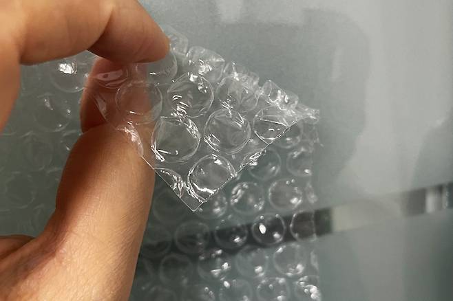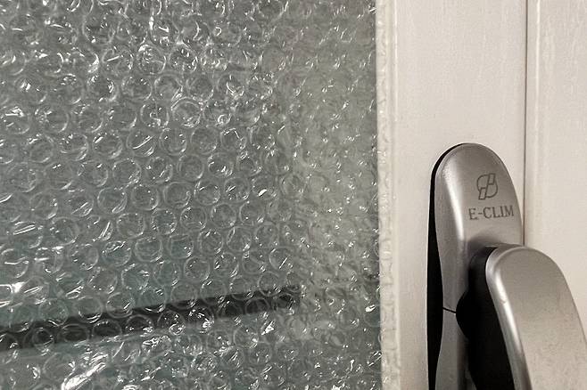 뽁뽁이를 붙여주시면 난방비 절약에 한몫 톡톡 하는데요. 뽁뽁이 붙일 때 평평한 쪽이 아닌 올록볼록한 부분이 창문에 닿게 붙이셔야 합니다.