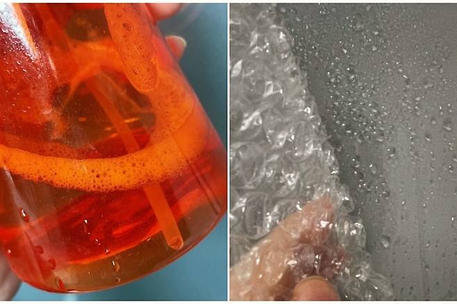 또한 그냥 물만 뿌려 붙이기보다는 주방세제를 살짝 섞어 뿌리면 접착 효과가 훨씬 높아진답니다. 붙일 때는 기포가 생기지 않게 안쪽에서 바깥쪽으로 밀어가며 붙이셔요.
