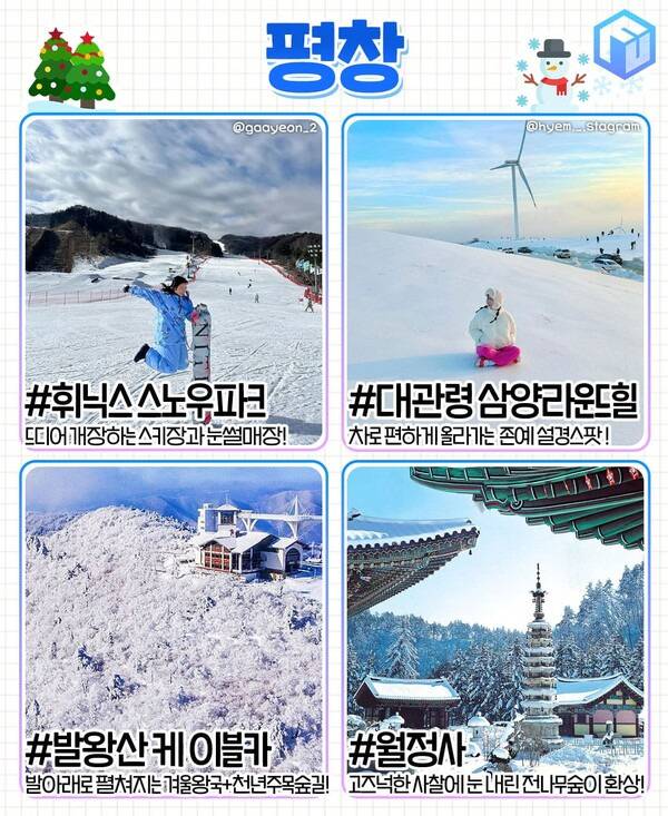 평창은 12월 국내 겨울 여행지로 빼놓을 수 없는 지역입니다. 새하얀 눈으로 뒤덮여 환상적인 설경이 펼쳐지는 곳이 특히 많기 때문인데요.
