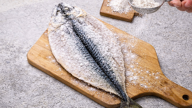 그다음 밀가루를 아주 얇게 묻힌다. 밀가루는 고등어 표면에 얇은 막을 형성해 수분 증발을 막고 기름 흡수를 줄이는 역할을 한다. 과하게 묻히면 오히려 타입 위험이 커지므로 여분은 반드시 털어낸다.