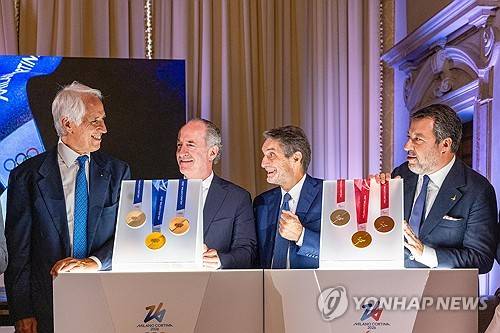 epa12239620 A handout photo made available by the Veneto Region Press Office shows (L-R) Giovanni Malagò, President of the Milano Cortina Foundation; Luca Zaia, President of the Veneto Region; Attilio Fontana, President of the Lombardy Region; and Matteo Salvini, Deputy Prime Minister and Minister of Transport and Infrastructure, during the presentation of the medals for the Milano Cortina 2026 Winter Olympic and Paralympic Games, in Venice, Italy, 15 July 2025. EPA/Veneto Region Press Office HANDOUT TO BE USED EXCLUSIVELY TO ILLUSTRATE THE RELATED NEWS ON 15 JULY/NO ARCHIVE/HANDOUT EDITORIAL USE ONLY/NO SALES