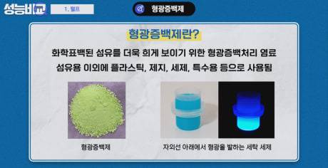 형광증백제란 섬유나 종이를 하얗게 만드는 물질로, 재활용된 원료에 형광증백제가 사용되었다면, 휴지에도 형광증백제가 검출되기도 합니다.