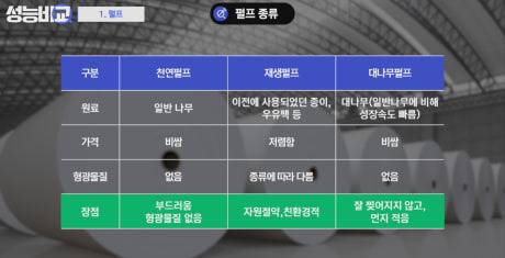 비교에 사용된 제품은 천연펄프 9개, 재생펄프 7개, 대나무 펄프 4개입니다.
