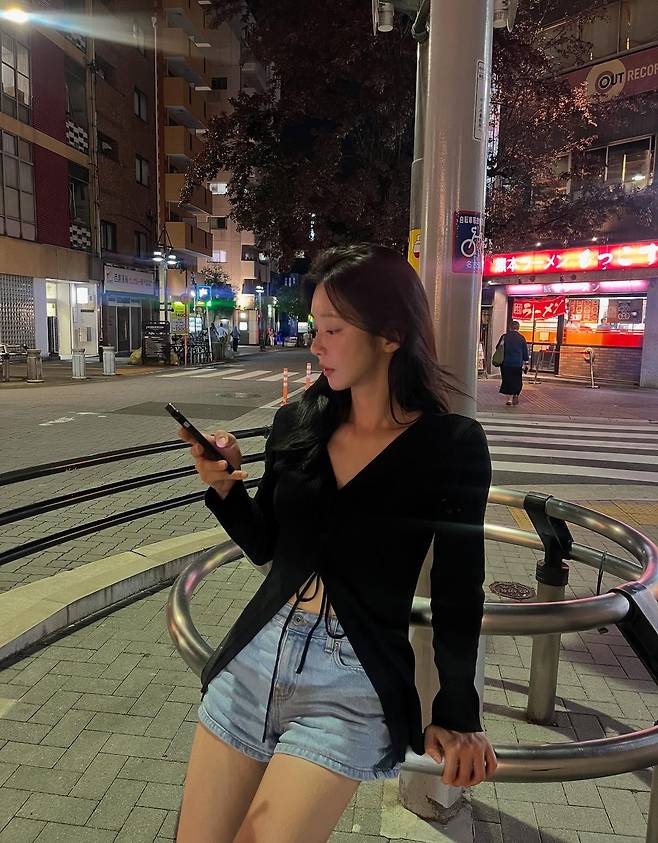 블랙 니트 톱은 가녀린 실루엣을 따라 자연스럽게 흐르고, 슬림한 라인 덕분에 도시의 야경과도 은근한 조화를 이루고 있죠.