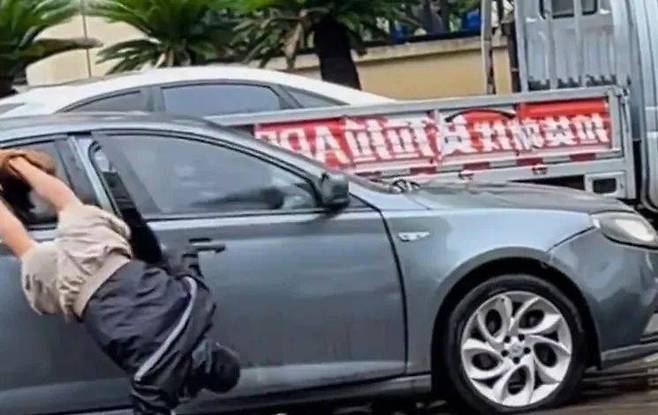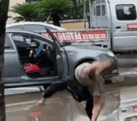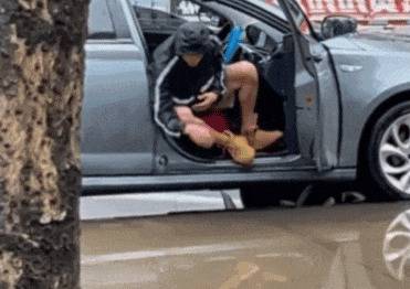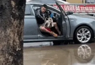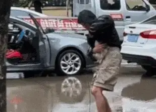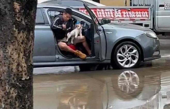 주차한 곳에 우연히 물웅덩이가 있어서, 주인은 강아지가 진흙탕 물에 빠지지 않도록 아주 조심스럽게 대책을 마련했습니다.