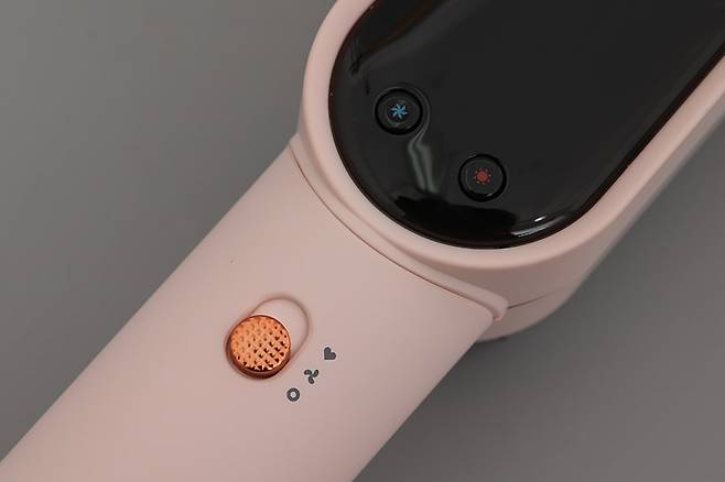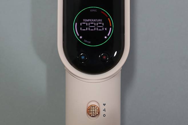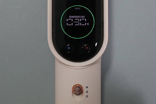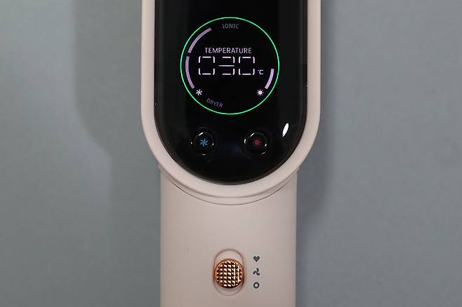 스크린 아래에 풍량 조절 버튼과 온도 조절 버튼이 있는 것도 동일하며, 손잡이 부분에 모드 스위치가 있는 것도 다르지 않다.