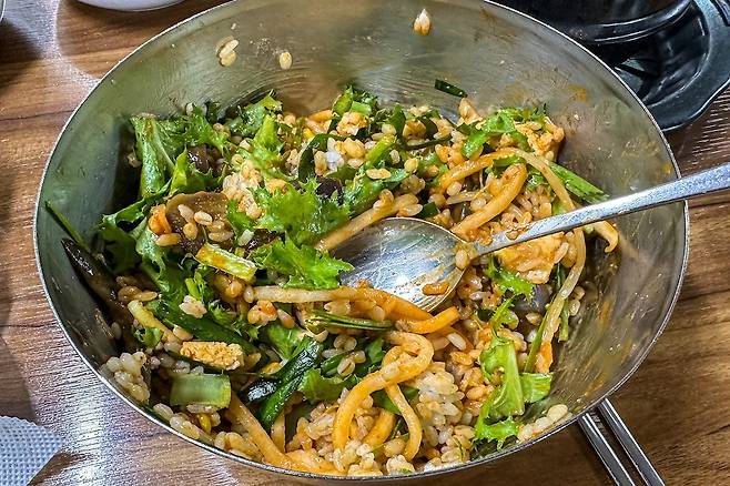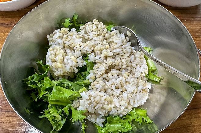 나이가 있으신 분들은 감자 덩어리가 들어간 된장찌개가 익숙할 텐데 바로 그런 된장찌개가 나온다. 거기에 밥은 보리밥이다. 주문하면 양푼에 채소가 담겨 나오는데, 거기에 보리밥을 올리고 이런저런 반찬도 좀 더 넣고 돌솥에서 보글보글 끓고 있는 된장찌개를 넣고 고추장 살짝 넣어 참기름 두른 후 비벼 먹으면 끝장이다.