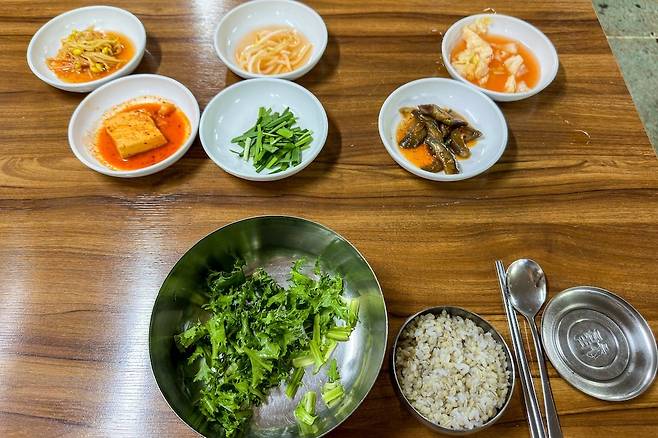 시골된장야채비빔이 이렇게 탄생한다. 혼자 가면 조금 손해를 볼 수 있으니 최소 2인은 맞춰 가는 게 좋다. 혼자 가면 계란찜을 안 주신다. ㅜ.ㅜ 특히 직장인 점심시간에 맞춰가면 자리도 없고 혼밥은 안될 가능성도 있다. 여기 된장은 잘 발효된 덕분에 특별한 육수를 사용하지 않고 맹물로 끓인다고 한다. 그래서 된장찌개임에도 불구하고 터프한 맛이 덜하고 깔끔하다. 스님도 드실 수 있을 정도로 자연의 맛을 살렸다.