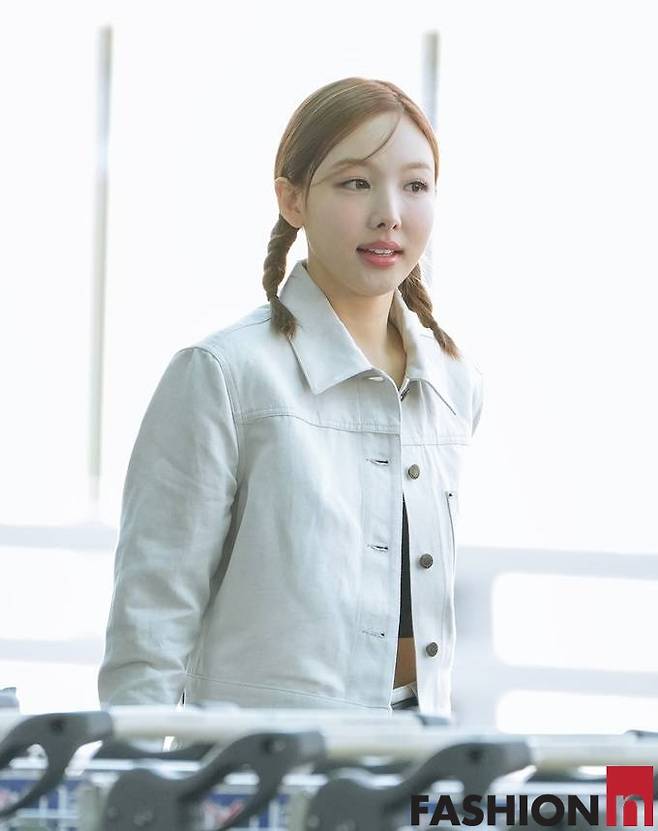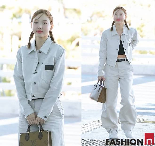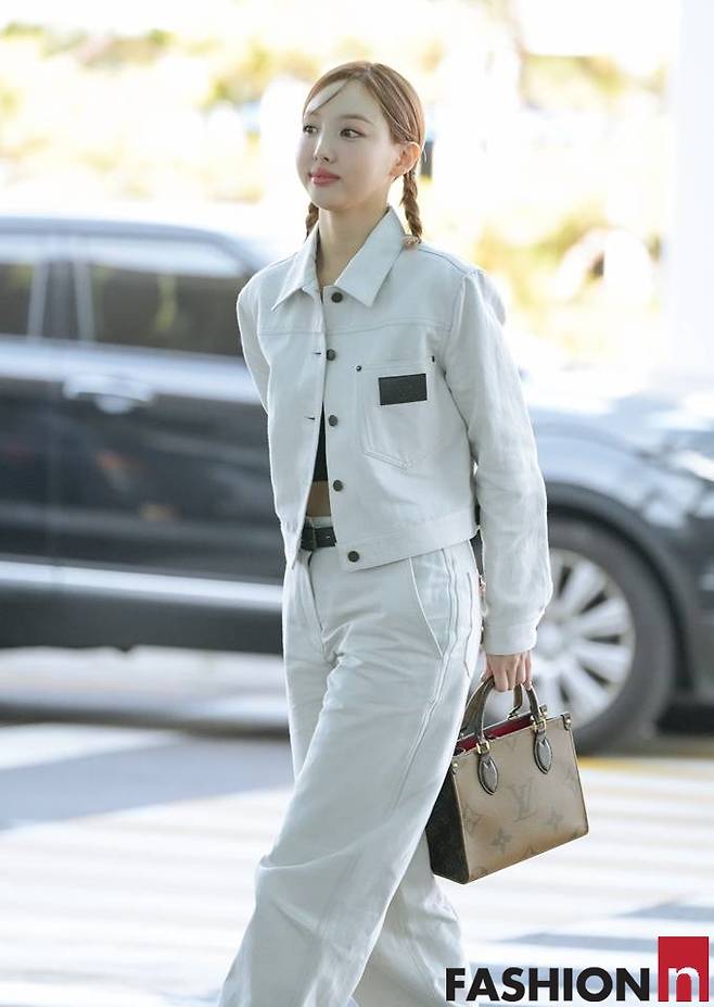 이날 나연은 댕기머리에 화이트 데님진과 팬츠 셋업의 올 화이트 데님룩으로 스타일리시한 공항패션을 사로잡았다.