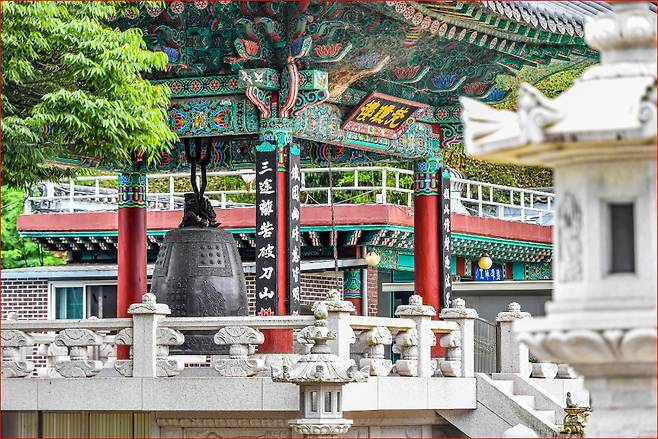 사찰 입구 한편에는 아름다운 범종이 설치되어 있습니다. 곡선미와 정교한 유곽, 연꽃 모양 유두 등한국 범종 특유의 형태미가 잘 보존되어 있어, 사진을 찍는 이들 사이에서도 인기 있는 포인트입니다. 종의 울림은 듣기 전부터 상상하게 되는 차분한 여운을 담고 있습니다.