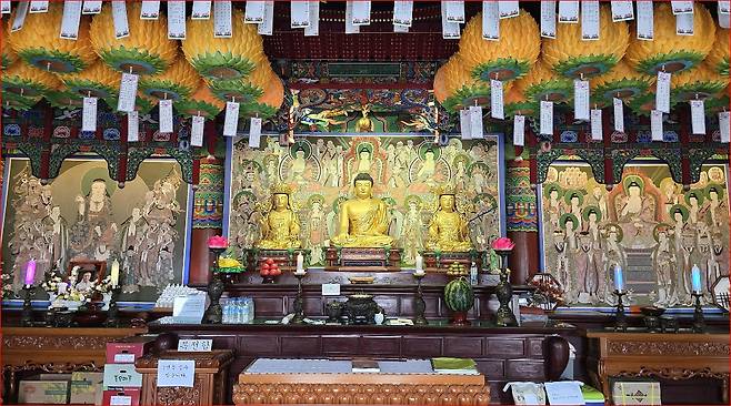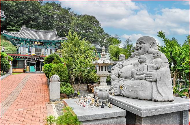 이곳의 대웅전, 관음전은 물론, 입구부터 마주하는 석조 약사여래입상은 1999년에 봉안된 것으로, 범상치 않은 기운이 느껴지는 인상적인 불상입니다. 석좌 아래에는 금강저를 든 금강야차상이 호위하듯 새겨져 있어 강력한 기운이 방문객을 맞이합니다.