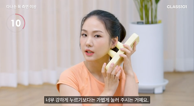 이번에는 흉쇄유돌근과 유양돌기를 풀어봅니다. 다나손의 돌기 한 부분으로 귀 뒤쪽에 톡 튀어나온 유양돌기 부분, 다른 돌기로는 귀밑에 림프 부분을 풀어봅니다. 너무 강하게 누르기보다는 가볍게 눌러줍니다. 가만히 자극을 주어도 좋고 좌우로 움직여도 좋습니다. 그다음, 흉쇄유돌근은 목을 따라서 꾹꾹 눌러줍니다. 다나손의 돌기 부분으로 흉쇄유돌근을 지그시 눌러줍니다.