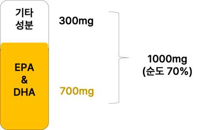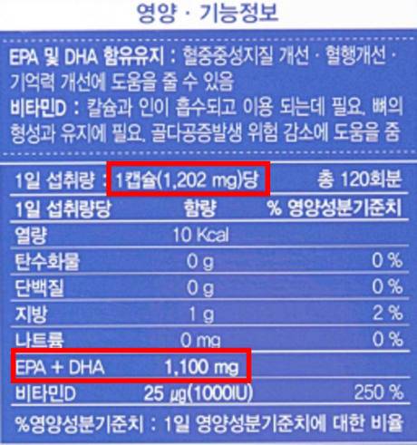 많은 오메가-3 제품들이 "캡슐당 1000mg 이상"이라고 표시되는데요, 이는 오일 전체의 무게를 의미합니다.