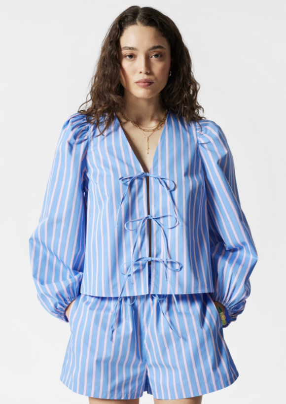 앤아더스토리즈(& Other Stories)의 타이 프런트 블라우스는 페미닌한 디테일과 시원한 소재가 어우러져 여름철 데일리룩에 최적화된 아이템으로 주목받는 제품이다.