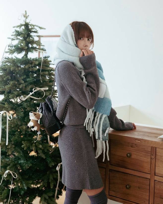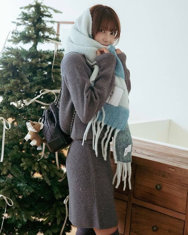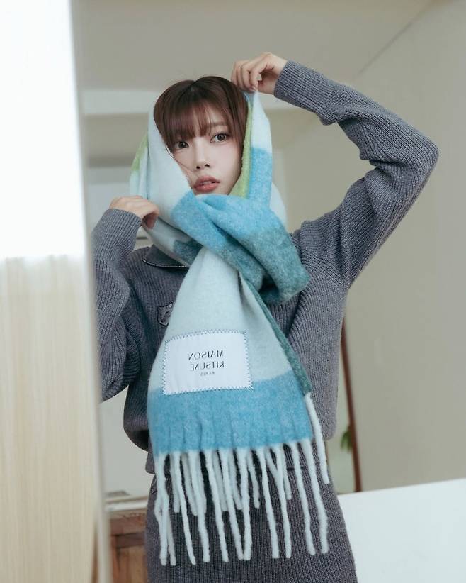 사진 속 박나언은 마치 겨울 숲 속의 요정처럼 따스하고 사랑스러운 분위기를 자아냅니다. 그 비결은 단연 그녀가 감싸고 있는 메종키츠네 24FW 패치로고 스트라이프 알파카 울 믹스 공용 머플러 덕분이죠.