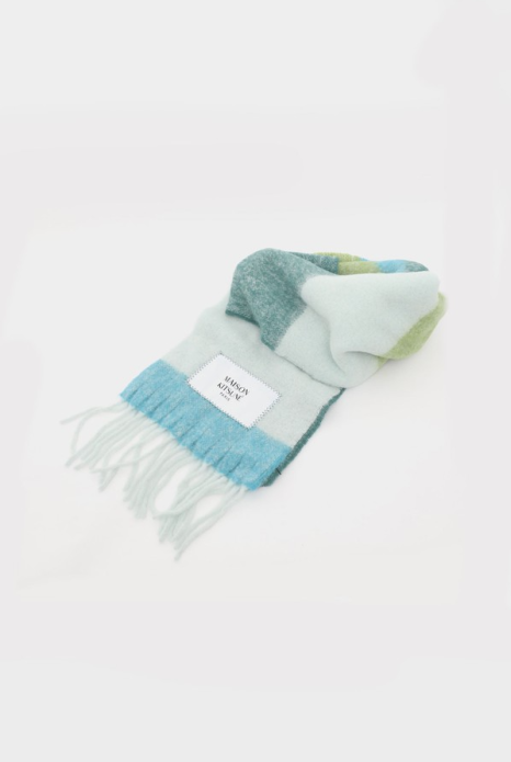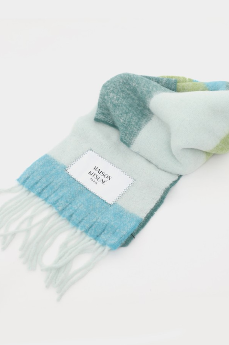 블루와 화이트 단가라 스트라이프 패턴이 캐주얼하면서도 세련된 인상을 주며, 머플러 한쪽에 자리한 메종키츠네의 패치 로고의 깔끔함!긴 프린지 디테일은 생동감 있는 디자인 포인트를 더합니다.