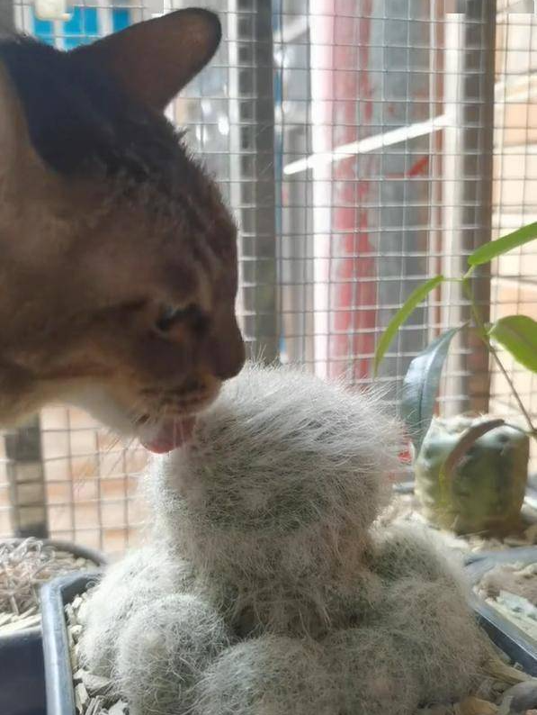 그런데 놀랍게도 고양이는 선인장 구근을 아주 맛있게 핥고 있었어요. 마치 미용사처럼 선인장 구근의 긴 털을 한 입 한 입 꼼꼼하게 핥으며, 마치 머리를 빗질해 주는 것처럼 진지하게 행동했습니다.