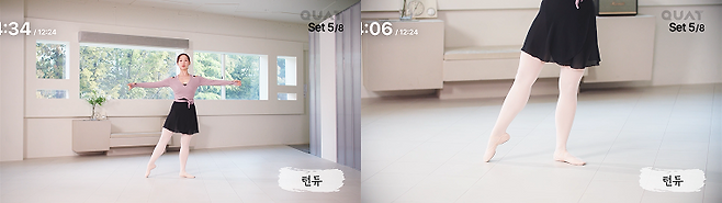 플리에(무릎 굽히기)는 하체 근육과 코어를 단련하고, 턴듀(발끝 뻗기)는 다리 라인을 매끄럽게 만들어 줍니다. 동작을 반복하면서 복부와 엉덩이에 힘을 주고, 몸의 중심을 유지해보세요.