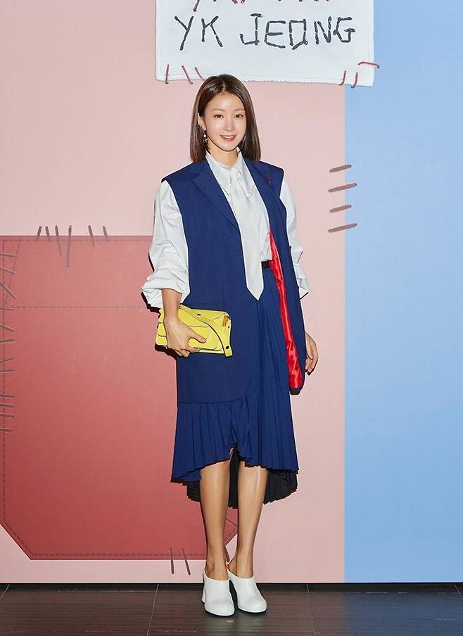 공개한 사진과 영상에서 이시영은 화이트 블라우스에 타이를 매고 미디 길이의 네이비 플리츠에 네이비 베스트 재킷을 걸친 슈트룩으로 멋스러우면서도 품격있는 나들이 스타일을 완성했다.
