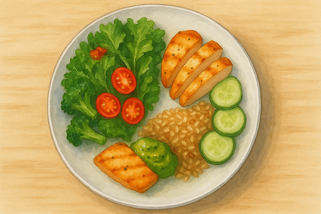 • 국물 없는 접시 : 접시 1/2 채소(상추·오이·방울토마토), 1/4 단백질(달걀 2개/두부/참치 in 물), 1/4 통곡(현미 반 공기/통밀빵 1장).
