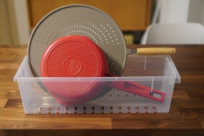 프라이팬을 눕혀서 보관하면 자리도 많이 차지하고, 위아래 프라이팬이 겹쳐지면서 코팅이 벗겨질 위험도 있는데, 이렇게 옆으로 보관하면 자리도 덜 차지하고 코팅 벗겨질 염려도 줄어서 일석이조예요.