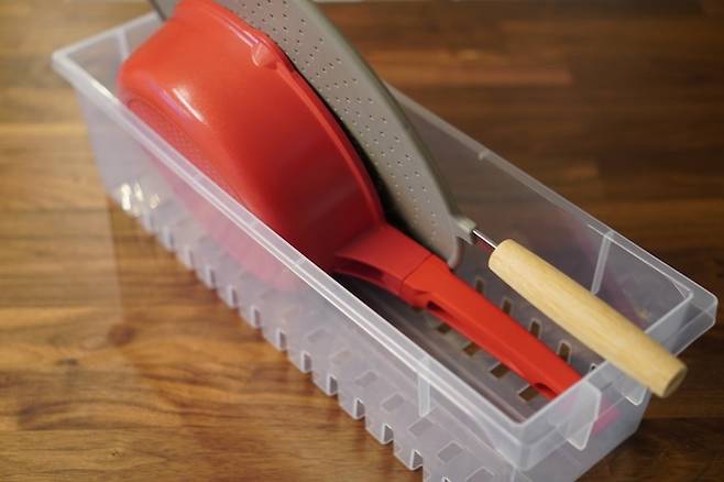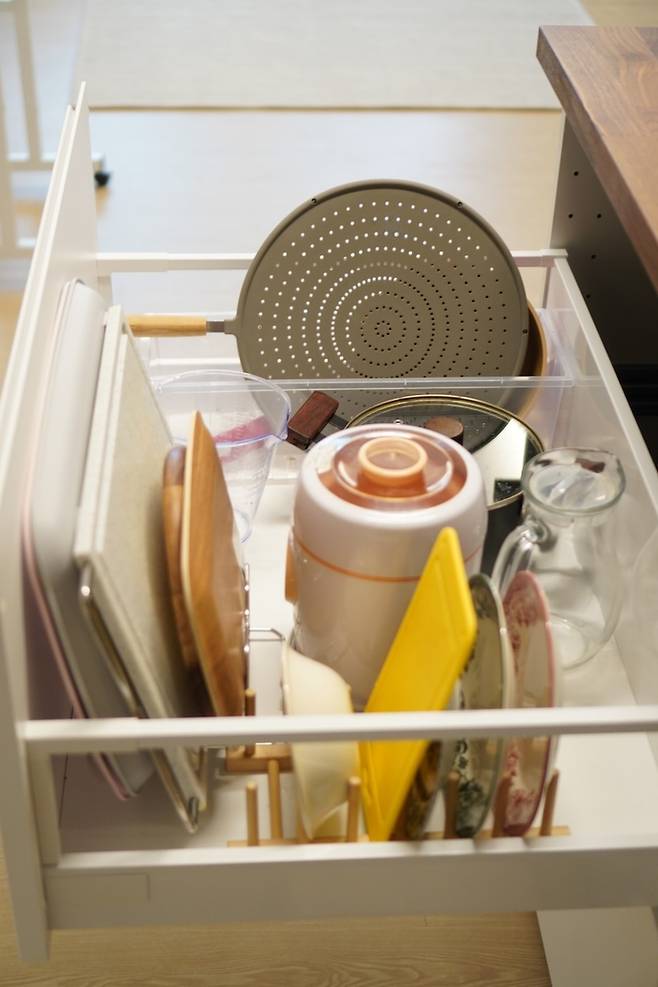 주방 서랍에 이렇게 접시 정리대와 칸칸이 정리함으로 구분해 줬더니, 같은 공간에 훨씬 더 많은 제품을 수납하면서도 구획이 나눠져서 쓰기에도 편리해졌어요.