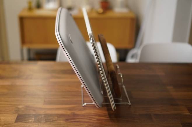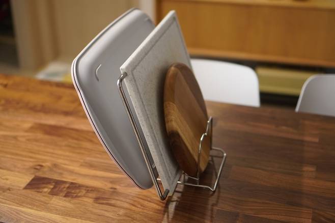 가격은 3천 원. 꽂는 칸이 4개라서 자리도 많이 차지하지 않아서 좋아요. 저는 이곳에 자주 사용하는 쟁반과 도마를 수납하고 있어요.