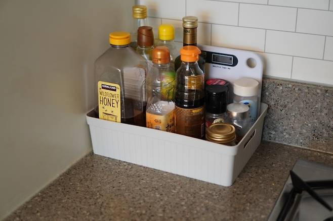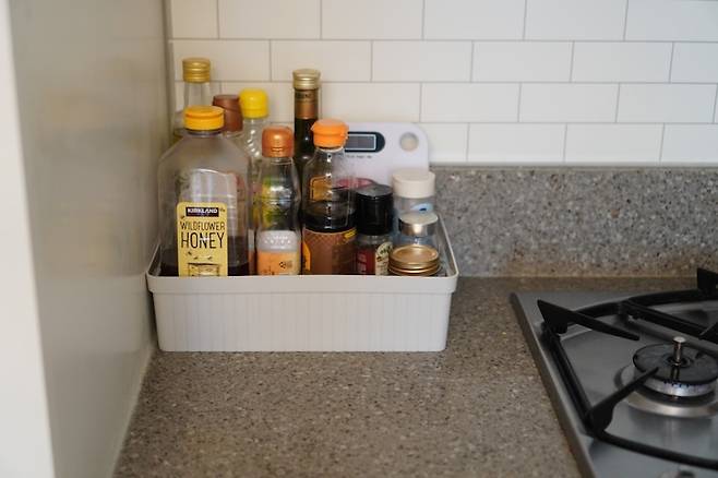 다이소에서 구매한 적당한 높이와 사이즈의 플라스틱 수납함에, 아래에는 키친타월을 깔아줬구요 그 안에는 자주 사용하는 양념들을 보관해 줬어요.